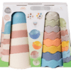 Deze speelse set bestaat uit twee vrolijke stapeltorens van duurzaam bioplastic: één toren met 8 onderdelen en één met 6 onderdelen. De zachte, rustgevende pastelkleuren maken de set niet alleen aantrekkelijk om mee te spelen, maar ook mooi om te zien. Kinderen kunnen de onderdelen stapelen in verschillende volgordes en zo telkens weer hun eigen kleurrijke bouwwerken creëren, wat de creativiteit en het probleemoplossend denken stimuleert.