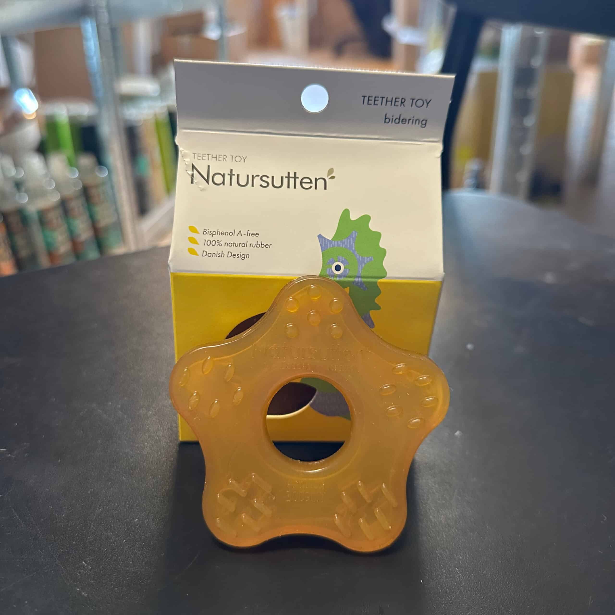 De Natursutten bijtring is gemaakt van 100% natuurlijk rubber en hierdoor heerlijk zacht om op te kauwen. De bijtring wordt met de hand gemaakt in Italië en is fluweelzacht! Dat komt doordat het is gemaakt van het eerste sap van de rubberboom. Hierdoor is deze mooi licht geel van kleur en zachter dan veel andere bijtringen van natuurrubber. Ook is de bijtring zachter dan silicone bijtringen. De ster heeft aan de punten zacht reliëf zodat het tandvlees gemasseerd wordt. Fijn voor jouw kleintje als de tandjes doorkomen.