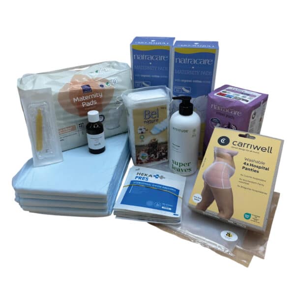 Compleet natuurlijk kraampakket basis met alles wat je nodig hebt voor bevalling en de eerste dagen na de geboorte