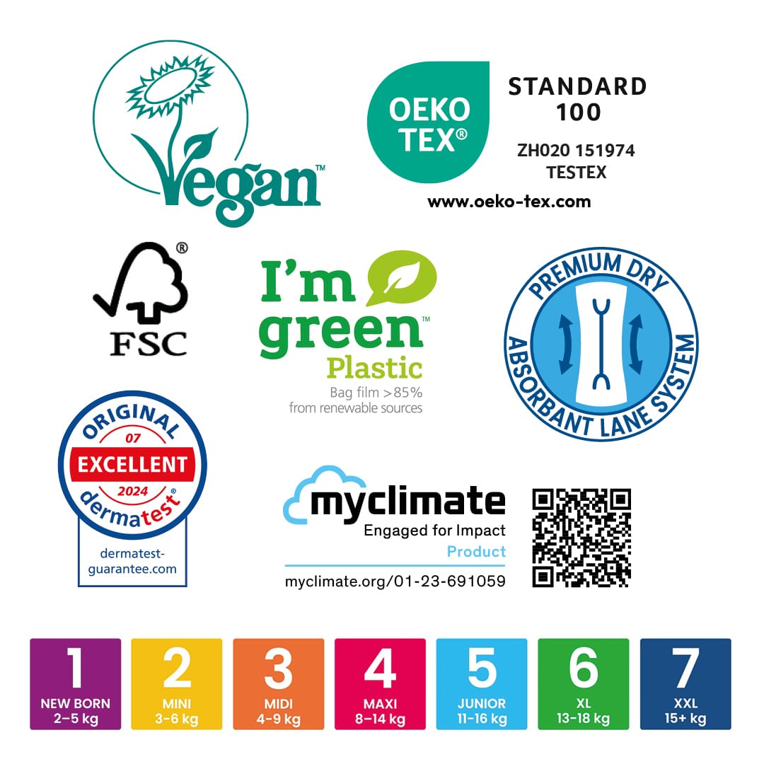 Ecologische luiers verkrijgbaar in maat 1 t/m 7. Geschikt vanaf de geboorte.