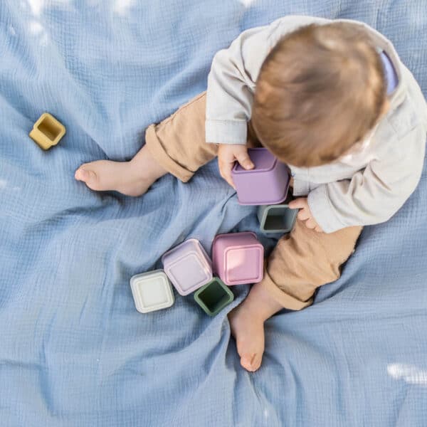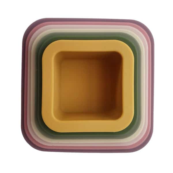 Stimuleren spel en creativiteit van je kindje met deze duurzame stapeltoren van veilig gekeurde siliconen. De set bevat 7 vierkante bekers die zowel in elkaar passen als op elkaar gestapeld kunnen worden.