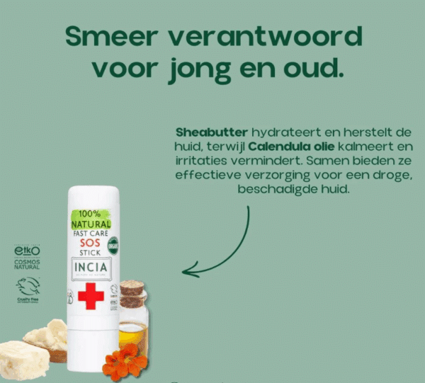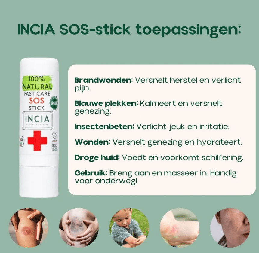 De stick is ideaal voor gebruik bij insectenbeten, krabwondjes, schrammen, lichte verbrandingen en andere huidbeschadigingen. Bovendien biedt de INCIA SOS-stick ondersteuning bij de verzorging van zonnebrand dankzij een krachtige mix van plantaardige oliën en actieve, 100% natuurlijke ingrediënten.