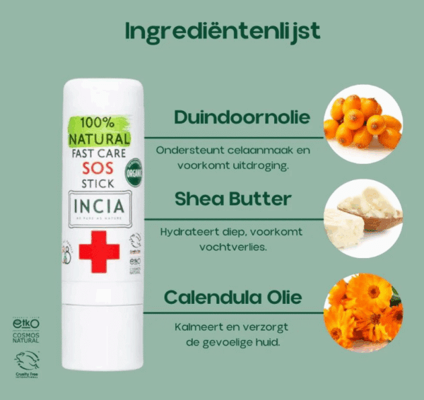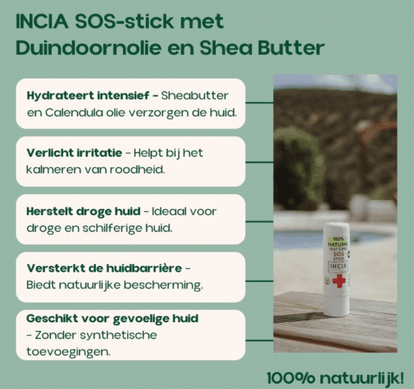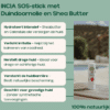 De INCIA SOS-stick met Duindoornolie en Shea Butter is een compacte en doeltreffende oplossing voor de verzorging van droge, beschadigde of geïrriteerde huid. De SOS-stick ondersteunt de natuurlijke huidbarrière, bevordert het herstel van kleine wondjes en helpt de huid haar vocht beter vasthouden. Droge of schilferige plekken worden intens gevoed en gekalmeerd.