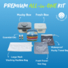 7. Maak de Mucky Box klaar door als eerste het wasnet in de box te bevestigen met de ‘wasknijpers’ in de hoeken.