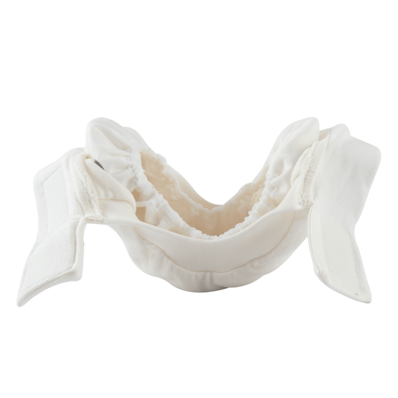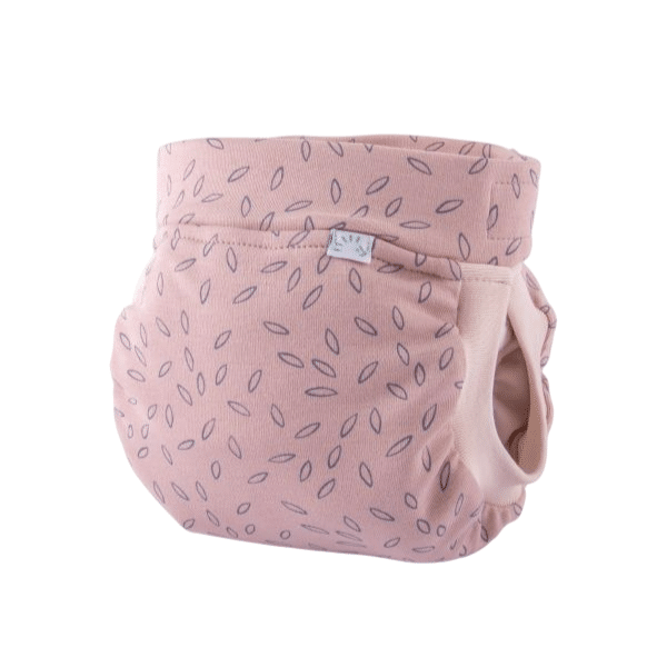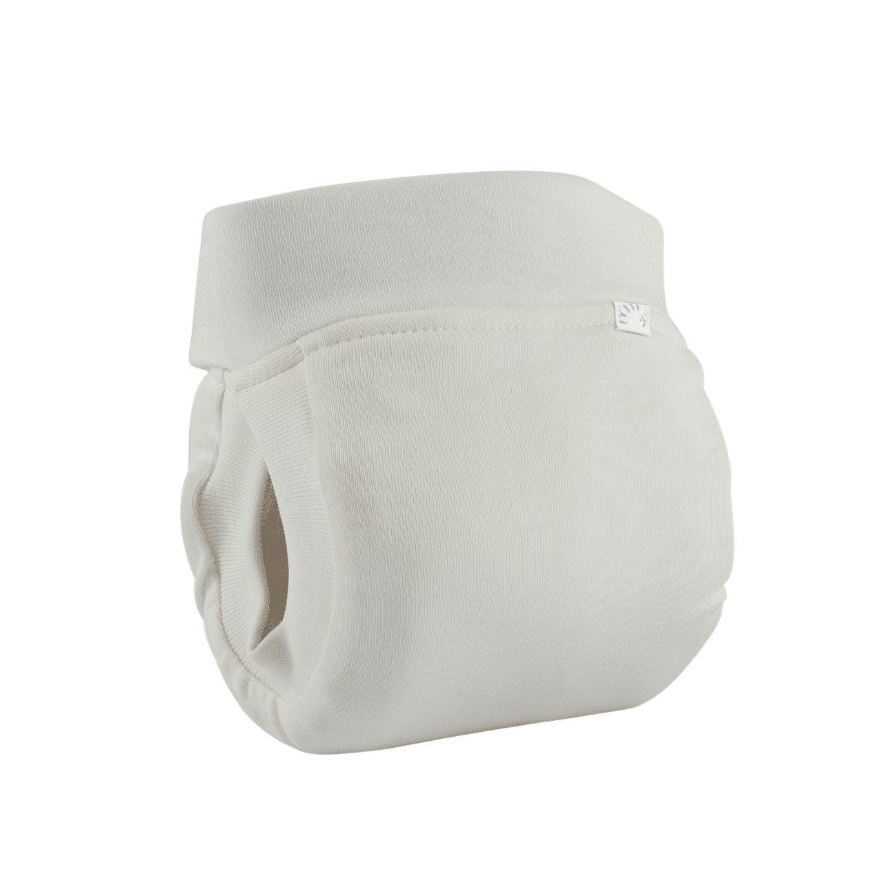 1. De overbroek/buitenluier met klittenband (sluit van voren naar achteren). Heeft zachte beenboorden voor veel comfort. Gemaakt van biologisch katoen.