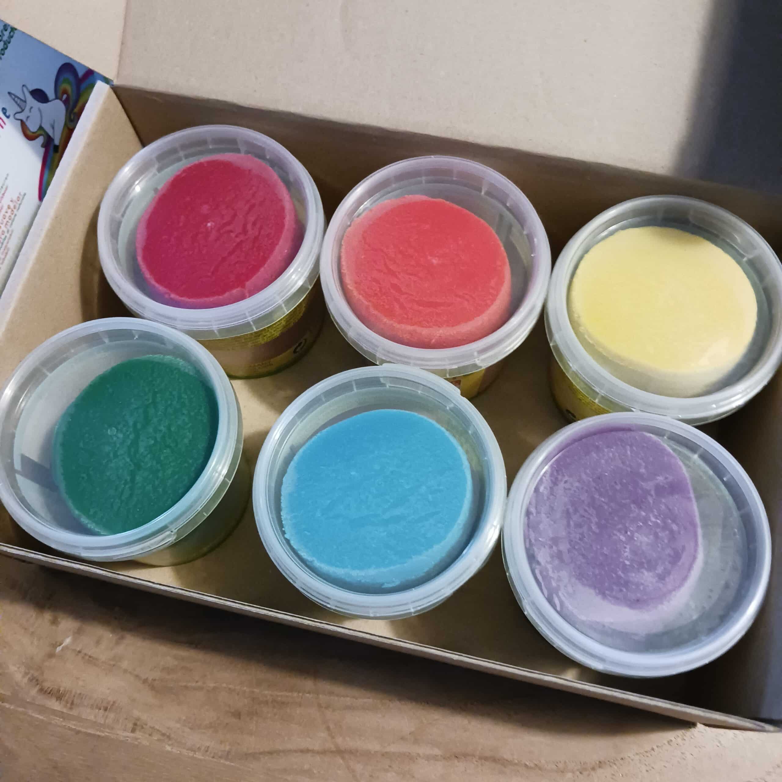 Zachte boetseerklei gemaakt van natuurlijke en hernieuwbare materialen, 6 potjes van 150 gram; geel, oranje, rood, blauw, paars en groen.